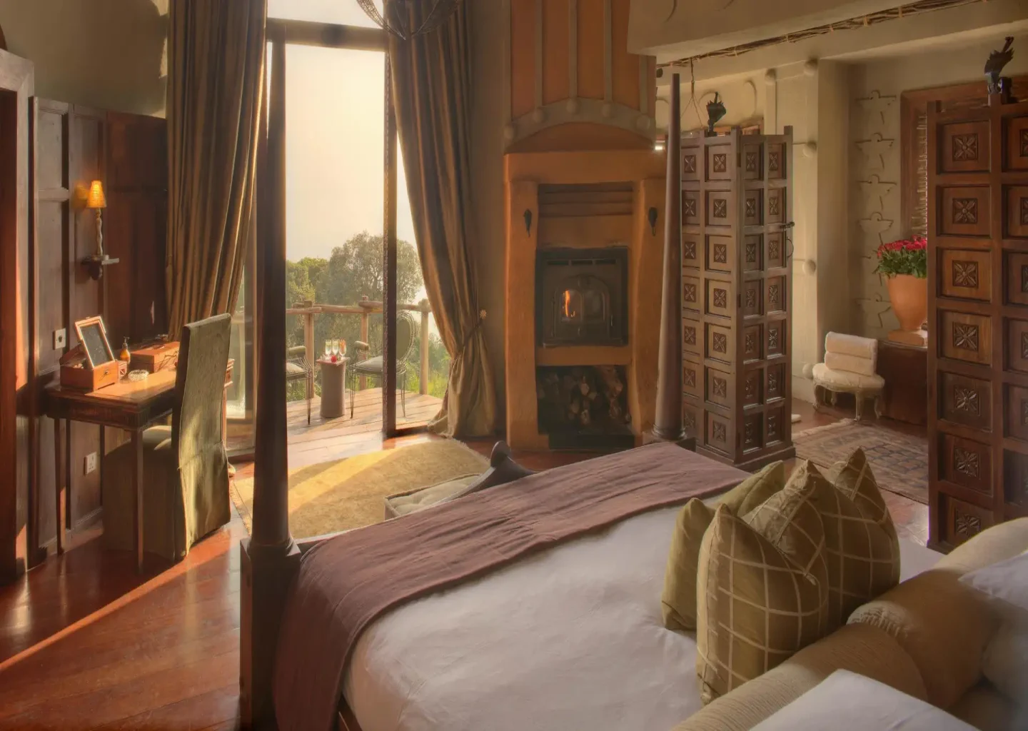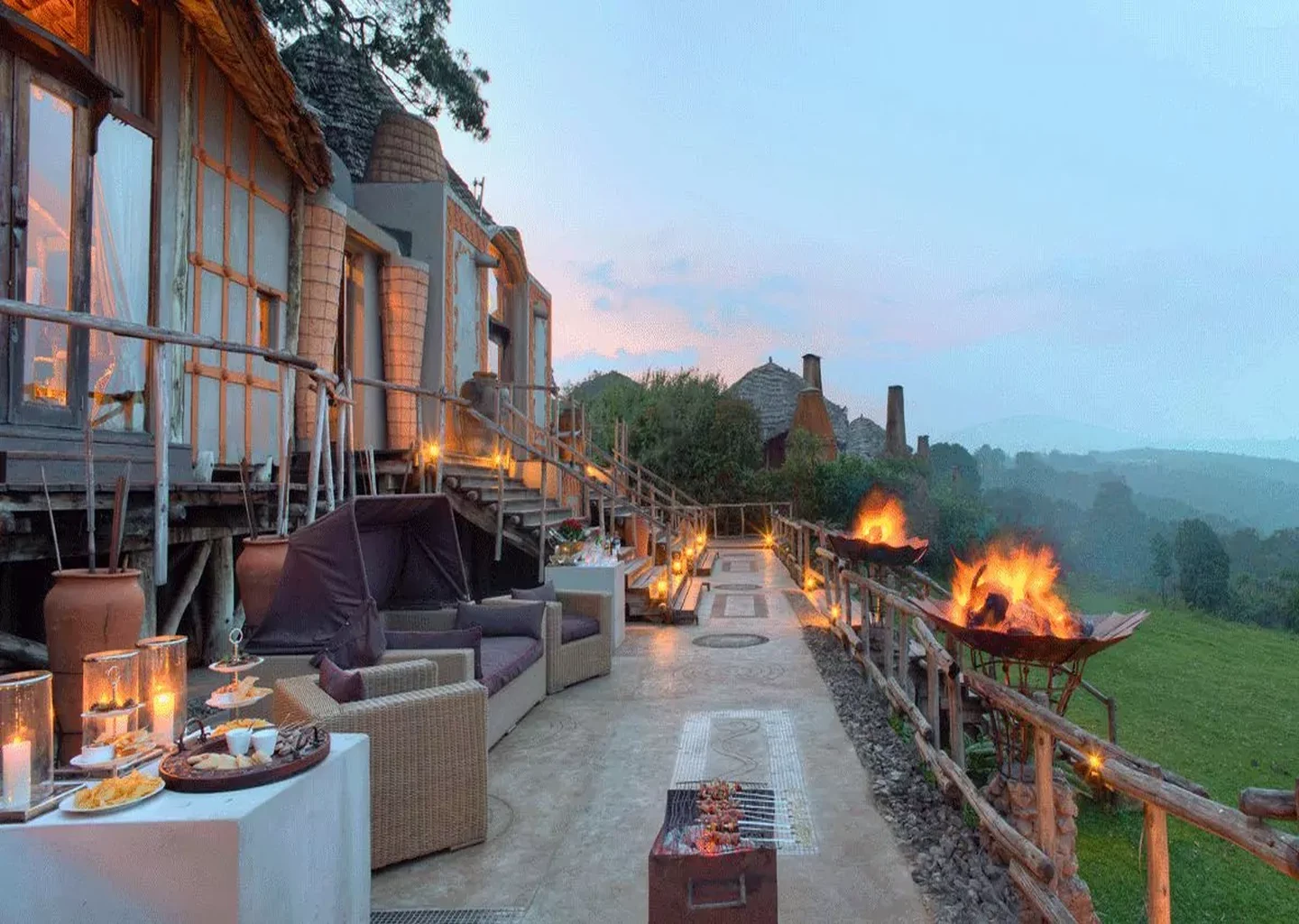 Its architecture gracefully blends African craft with touches of baroque romance — think carved wooden beams, chandeliers, and rich fabrics set against sweeping views of the crater below. Each luxurious suite features a private deck, floor‑to‑ceiling windows, and a personal butler service, ensuring comfort that feels both lavish and intimate.
