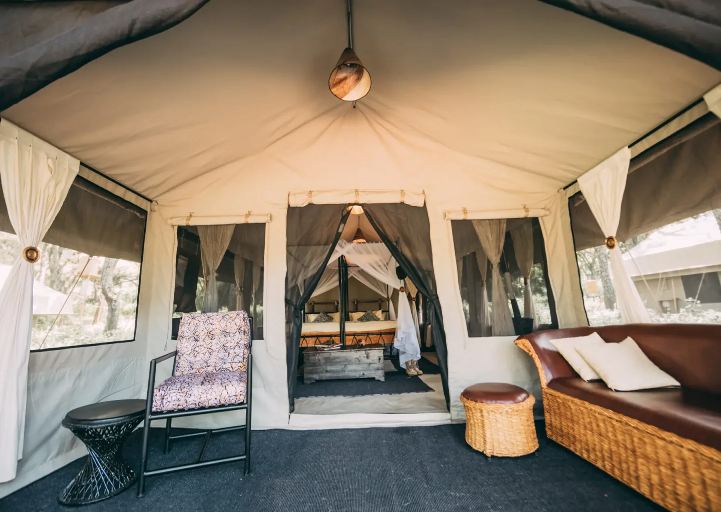 Each spacious tent features natural wooden furnishings, cozy bedding, and an inviting veranda where guests can watch the mist lift over the crater in the morning. The central lounge and dining area provide a warm, communal atmosphere, complete with fireside evenings and freshly prepared cuisine inspired by local ingredients.