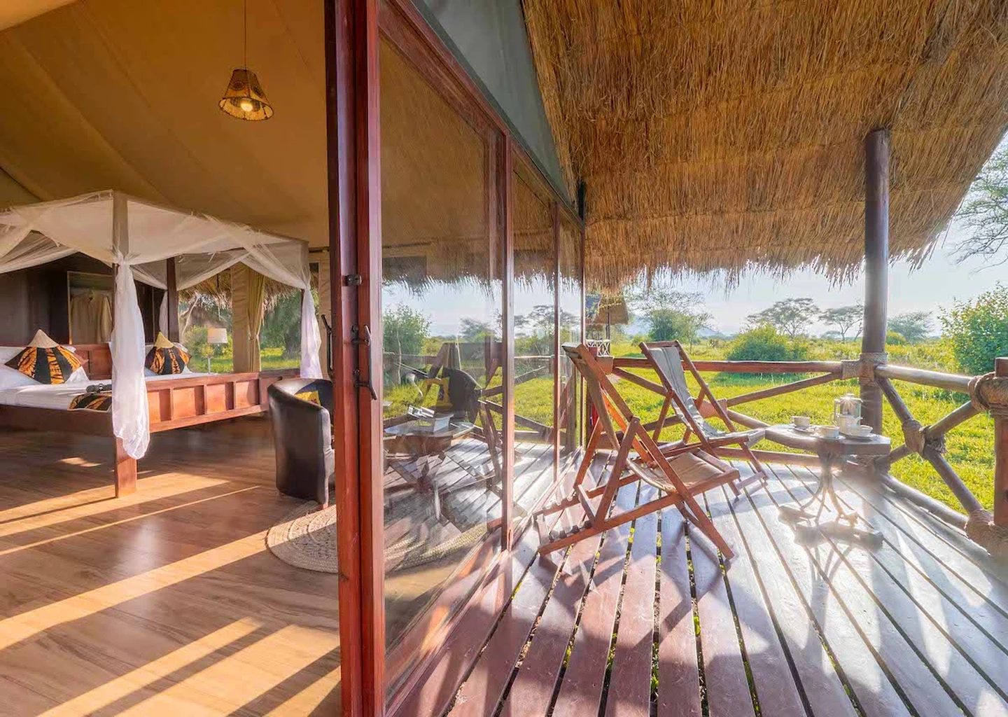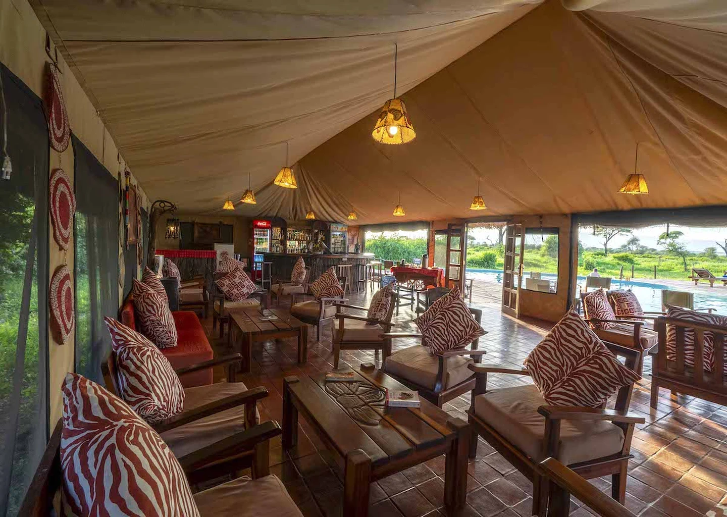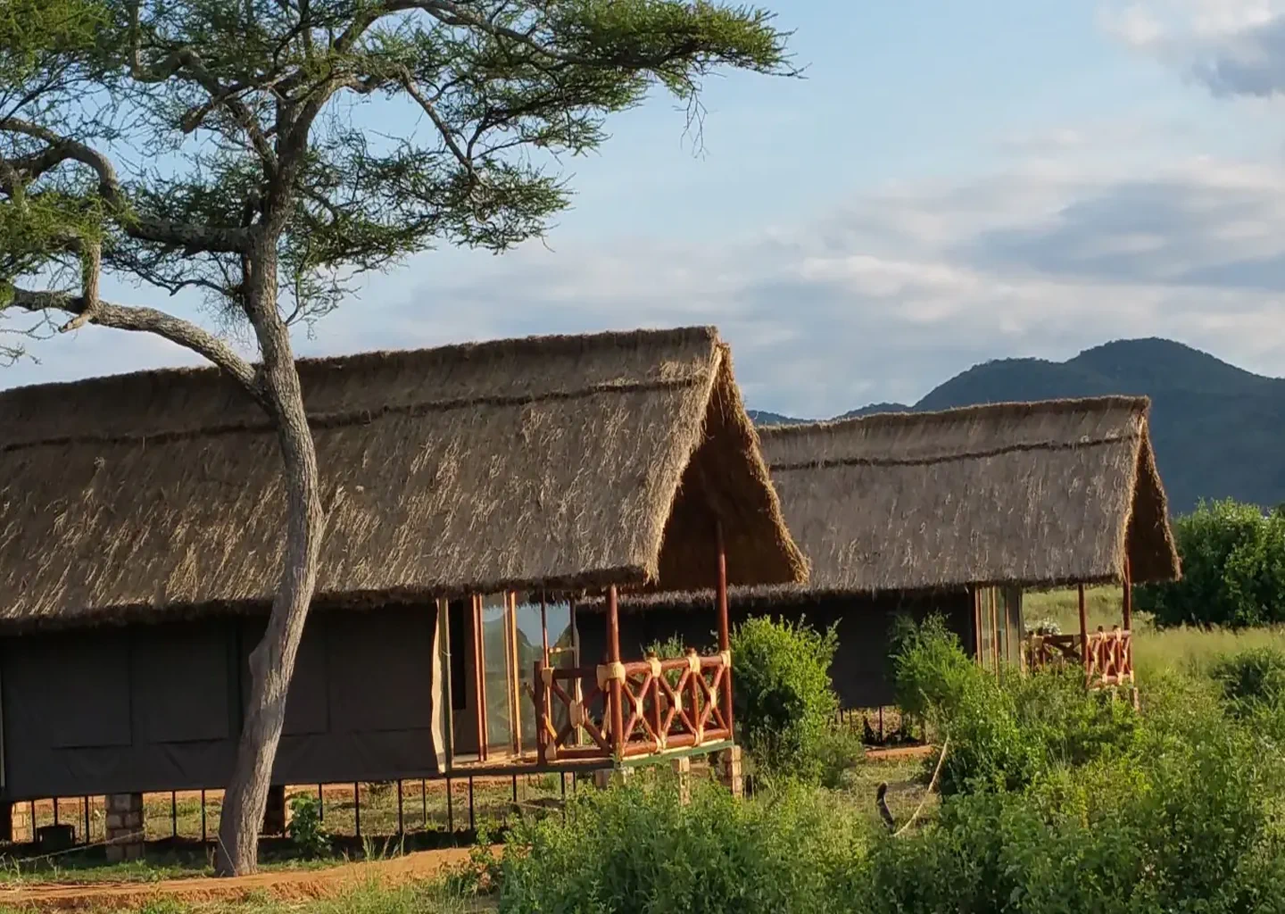 Each well‑appointed tented room sits on a raised platform with a private veranda, perfect for watching the park's famous elephants and antelope wander through the plains. The main lounge and dining area overlook a seasonal waterhole, often visited by wildlife — allowing guests to enjoy a genuine safari experience even from the comfort of the lodge.